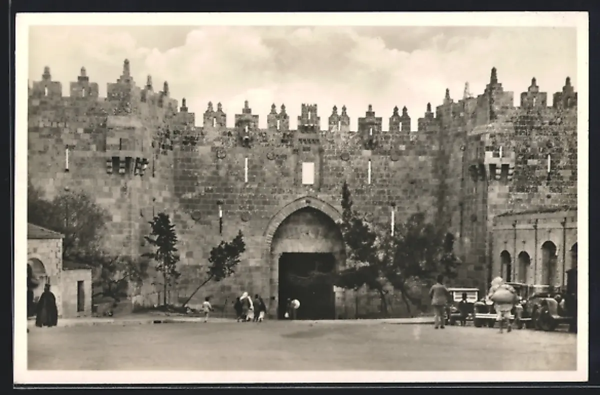 AK Jerusalem, Damaskustor mit Passanten