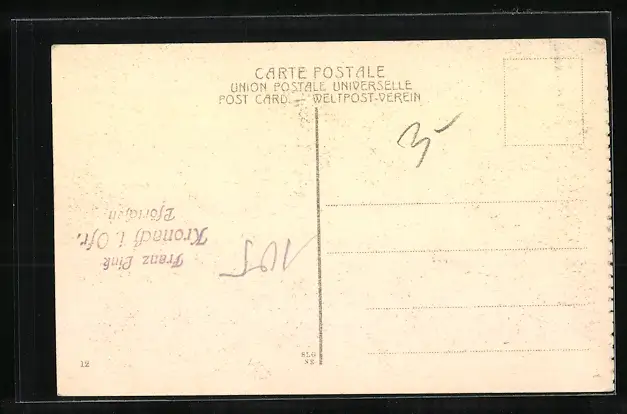 Personenbezogene Daten auf der Rückseite der Karte wurden durch blauen Textmarker unkenntlich gemacht. Die blauen Stellen sind auf die Vorderseite durchgeweicht und wirken sich negativ auf das Postkartenfoto aus