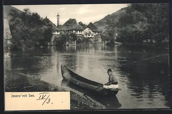 AK Jesero, Knabe im Ruderboot am Seeufer