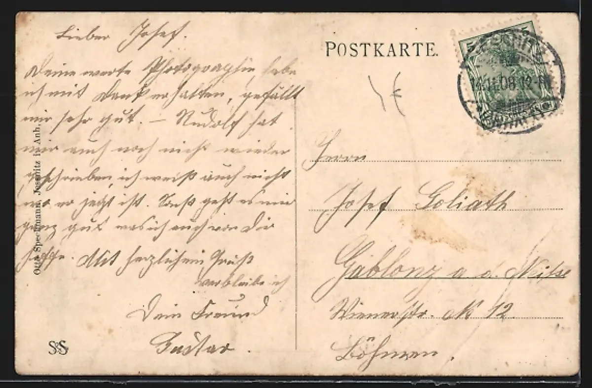 alte Ansichtskarte, gelaufen 1908, Bugspur li. unten, guter Zustand