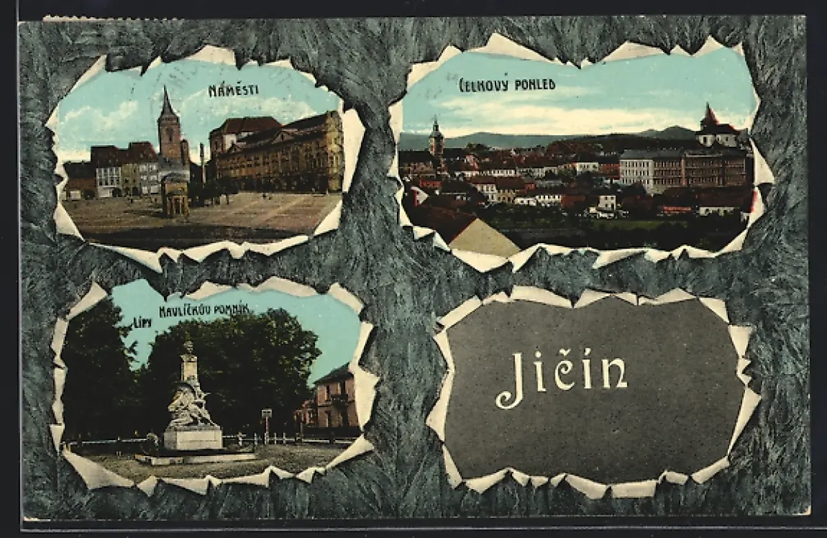 AK Jitschin / Gitschin / Jicin, Denkmal, Marktplatz, Gesamtansicht