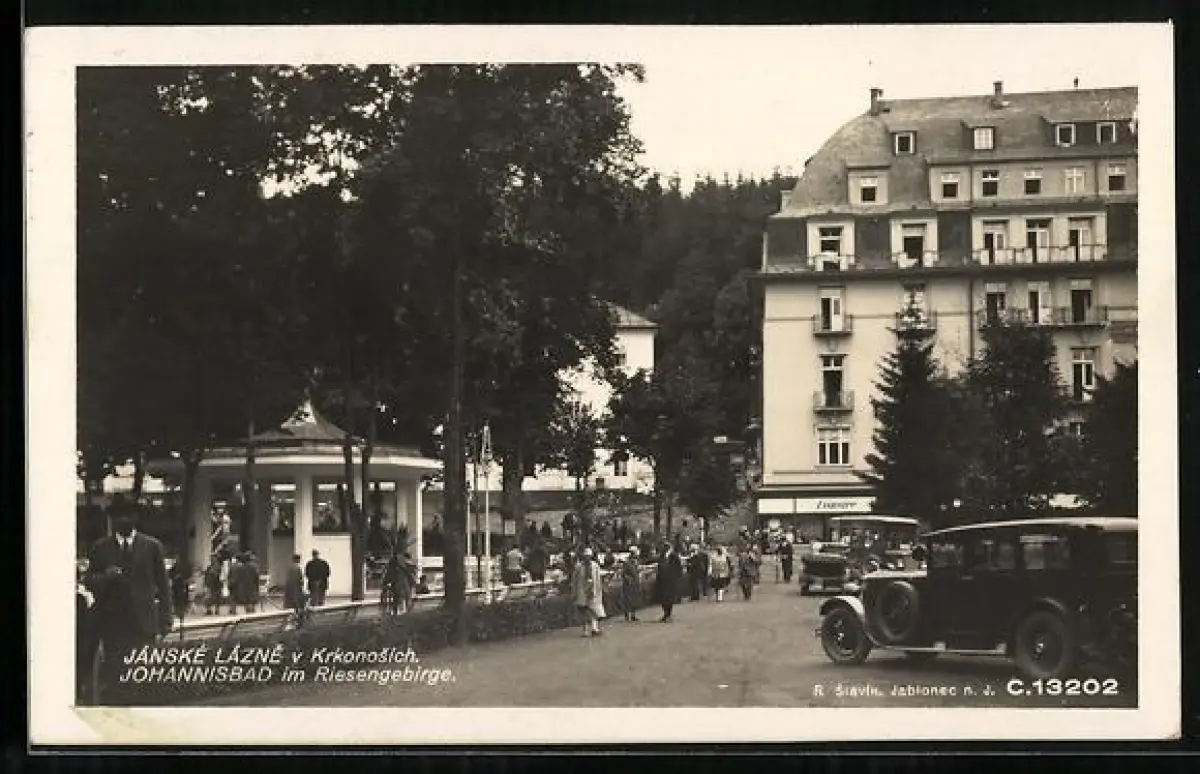 AK Johannisbad im Riesengebirge, Strassenpartie mit Pavillon u. Geschäftshaus
