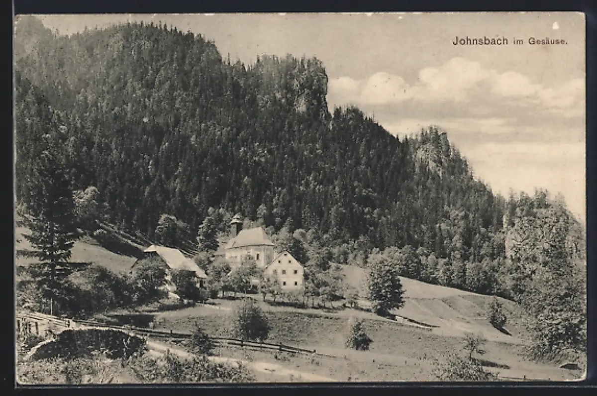 AK Johnsbach im Gesäuse, Ortspartie mit Turmgebäude