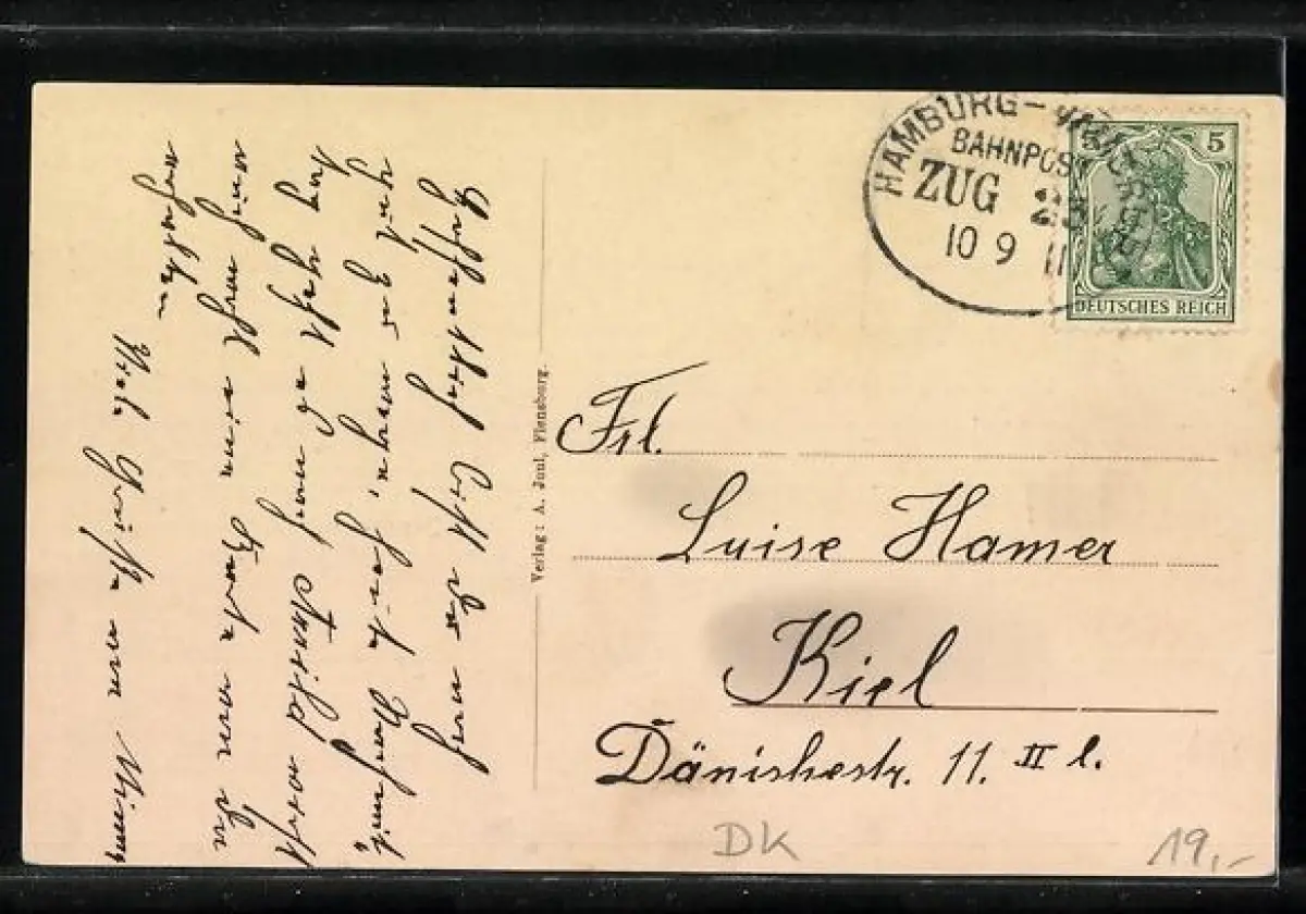 Personenbezogene Daten auf der Rückseite der Karte wurden durch blauen Textmarker unkenntlich gemacht. Die blauen Stellen sind auf die Vorderseite durchgeweicht und wirken sich negativ auf das Postkartenfoto aus