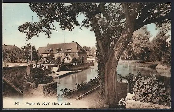 AK Jouy, Vue du Moulin et de la rivière dans le paysage verdoyant
