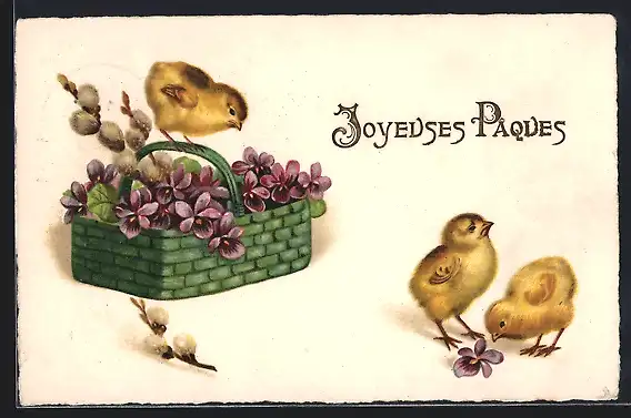 AK Joyeuses Pâques, Drei Osterküken und ein Veilchen-Korb