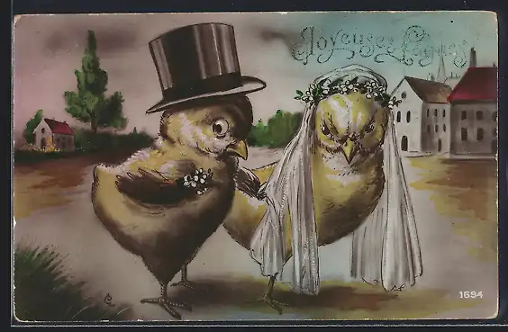 AK Joyeuses Pâques, Osterküken als Braut und Bräutigam