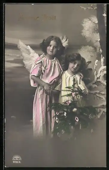 AK Joyeux Noel, Zwei Weihnachtsengel mit geschmücktem Tannenbaum