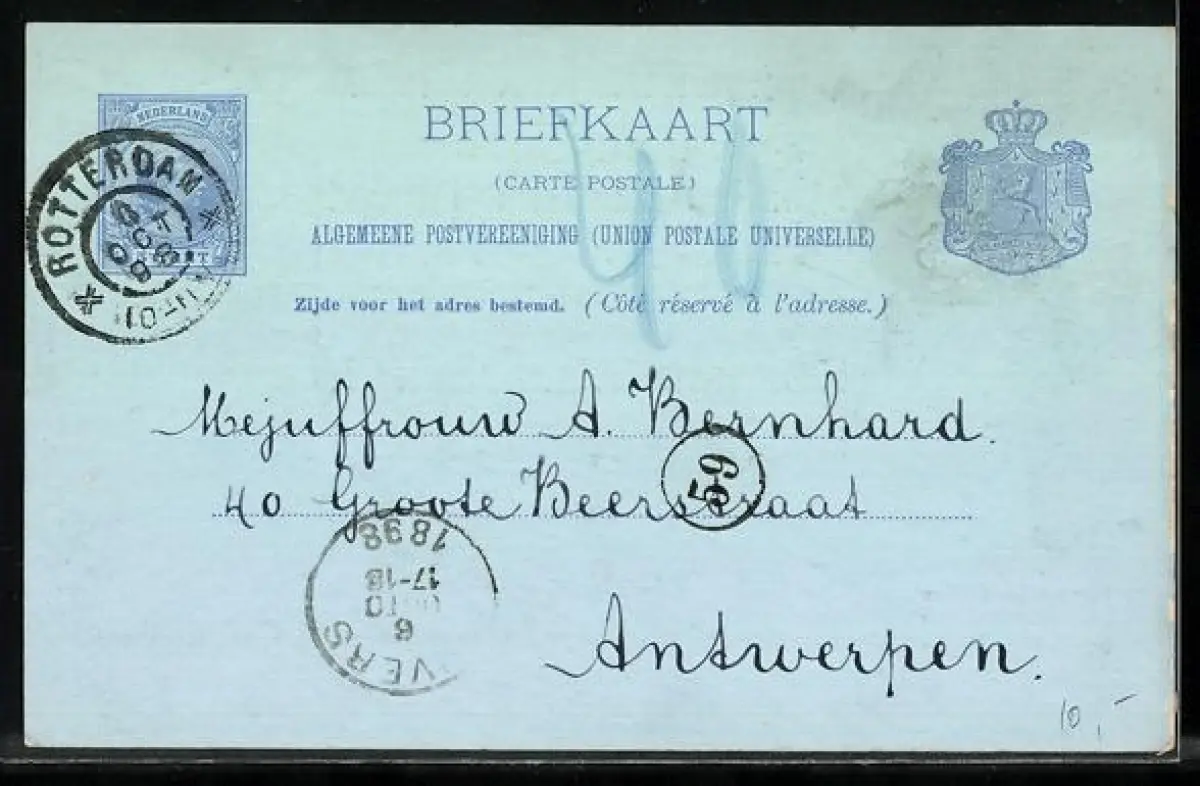 Personenbezogene Daten auf der Rückseite der Karte wurden durch blauen Textmarker unkenntlich gemacht. Die blauen Stellen sind auf die Vorderseite durchgeweicht und wirken sich negativ auf das Postkartenfoto aus