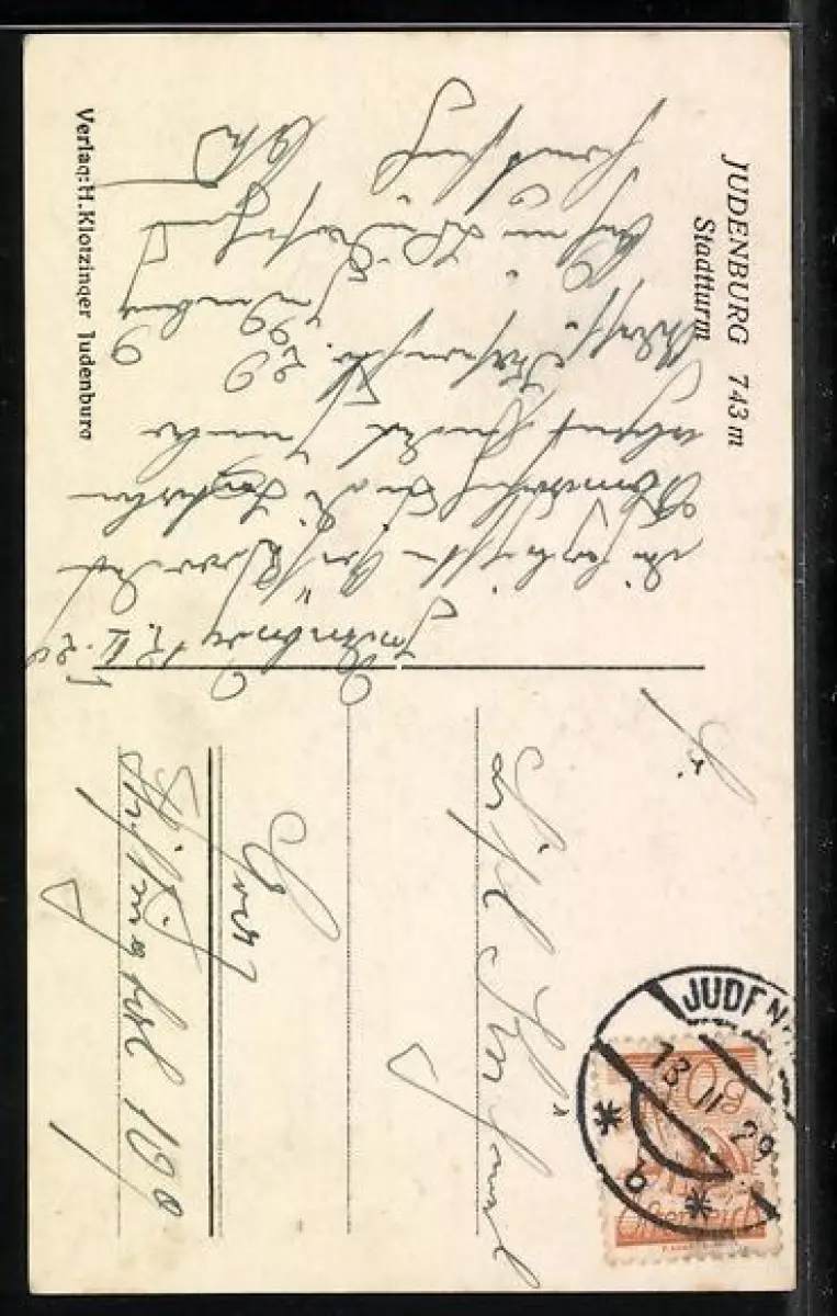 Personenbezogene Daten auf der Rückseite der Karte wurden durch blauen Textmarker unkenntlich gemacht. Die blauen Stellen sind auf die Vorderseite durchgeweicht und wirken sich negativ auf das Postkartenfoto aus