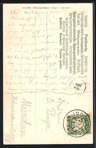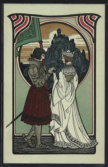 AK Jugendstil, Dame mit Krone hält mit der Wache Händchen