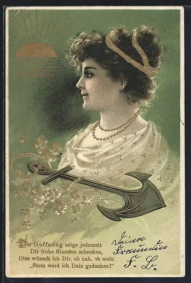 AK Jugendstil, Frau mit hochgestecktem Haar und Anker vor sich mit untergehender Sonne