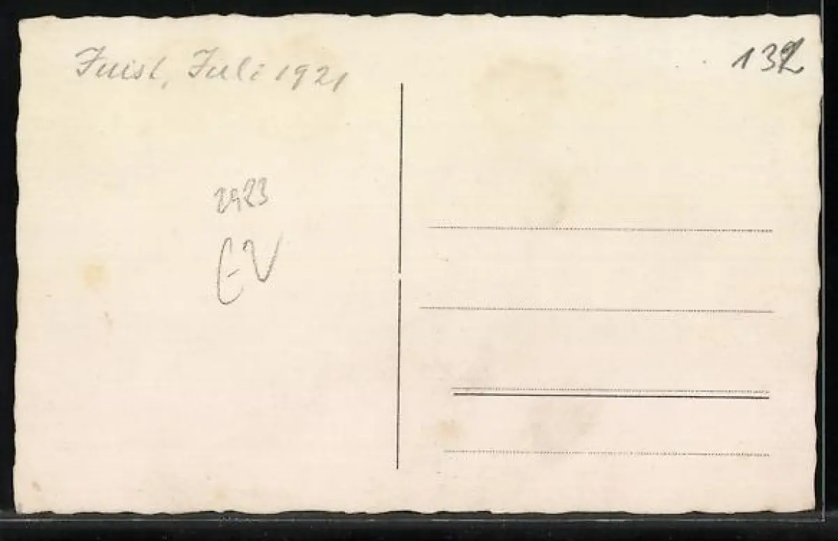 Personenbezogene Daten auf der Rückseite der Karte wurden durch blauen Textmarker unkenntlich gemacht. Die blauen Stellen sind auf die Vorderseite durchgeweicht und wirken sich negativ auf das Postkartenfoto aus