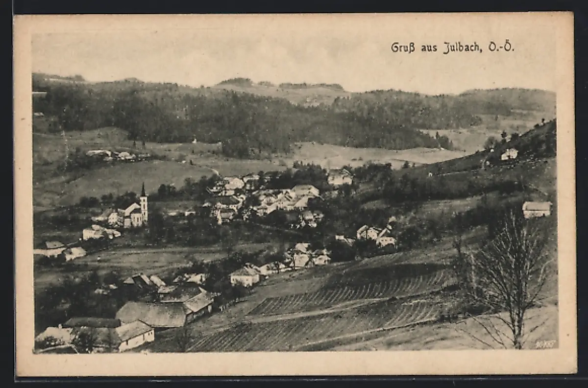 AK Julbach /O.-Ö., Totalansicht mit Feldern von einem Hang aus