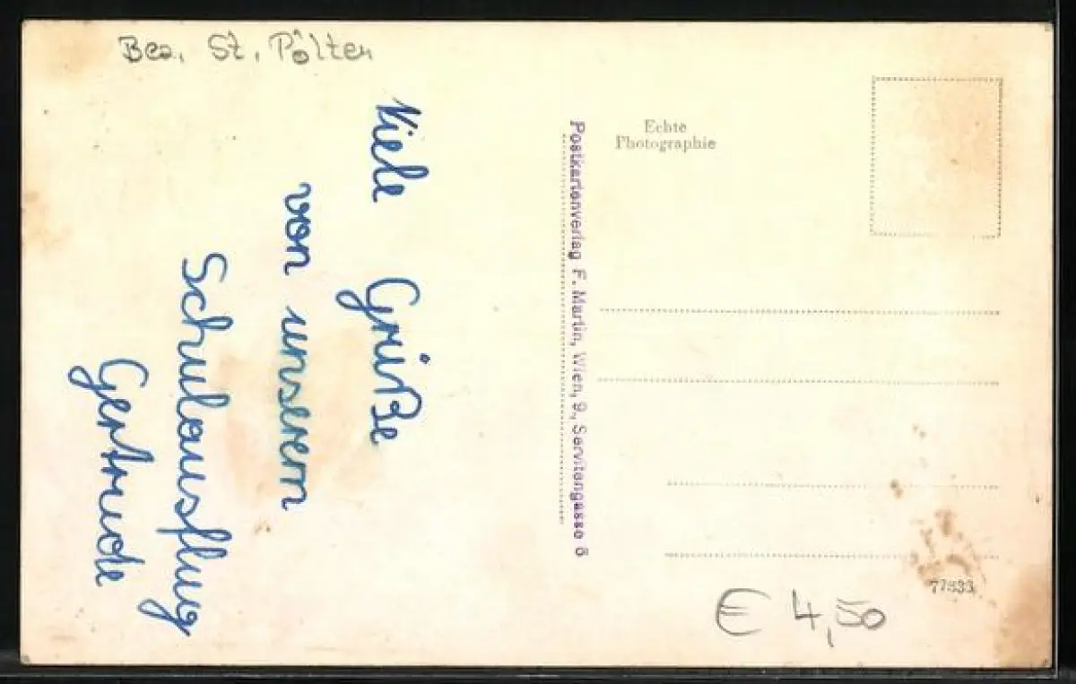 Personenbezogene Daten auf der Rückseite der Karte wurden durch blauen Textmarker unkenntlich gemacht. Die blauen Stellen sind auf die Vorderseite durchgeweicht und wirken sich negativ auf das Postkartenfoto aus
