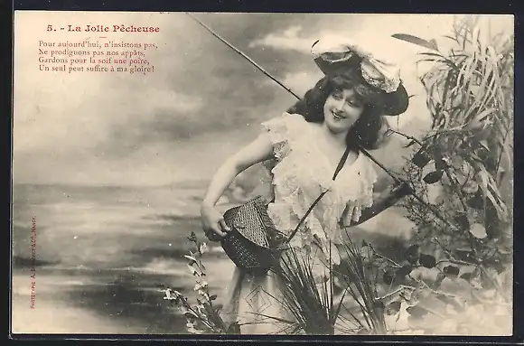 AK Junge Anglerin mit einer Korbtasche