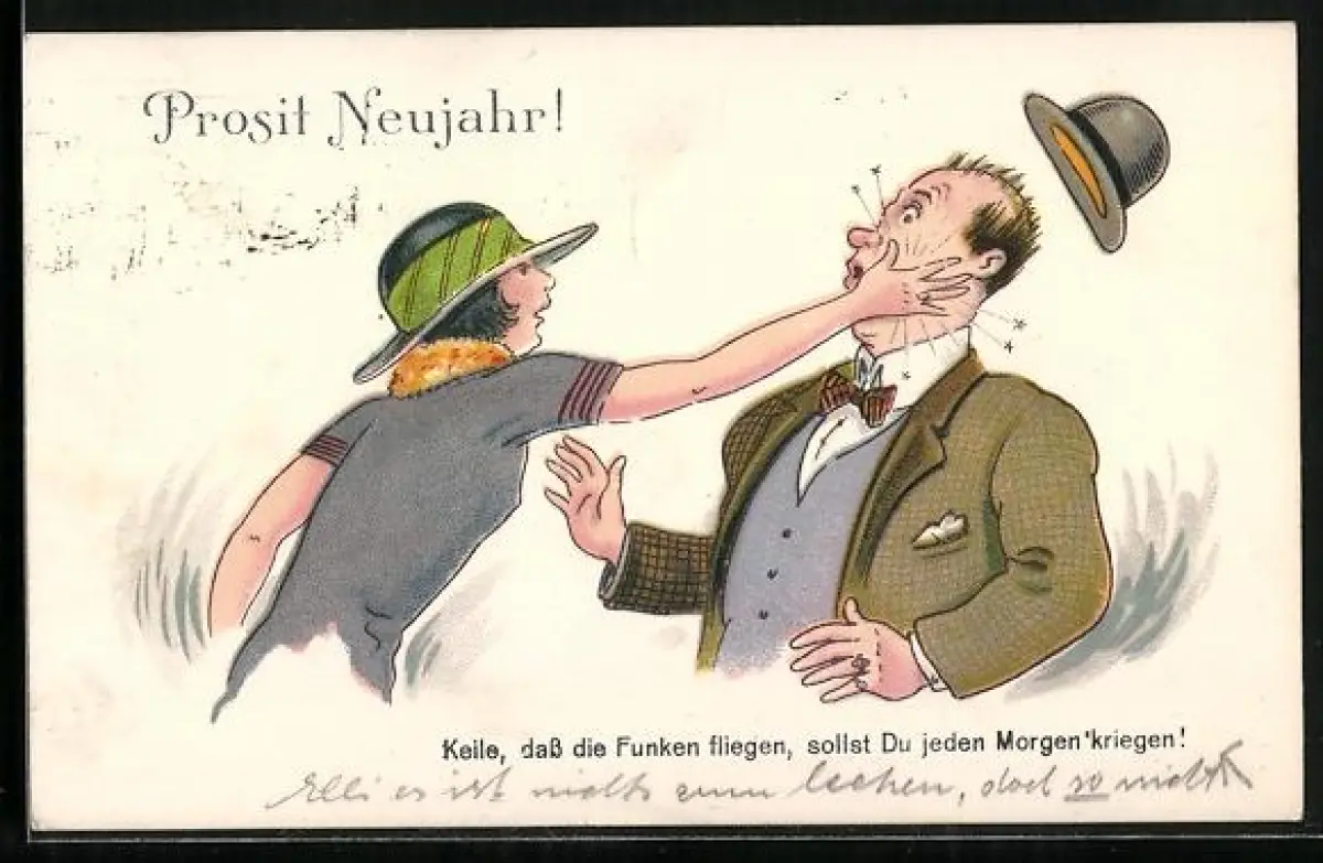 AK Junge Dame ohrfeigt Kavalier, Neujahrsgruss