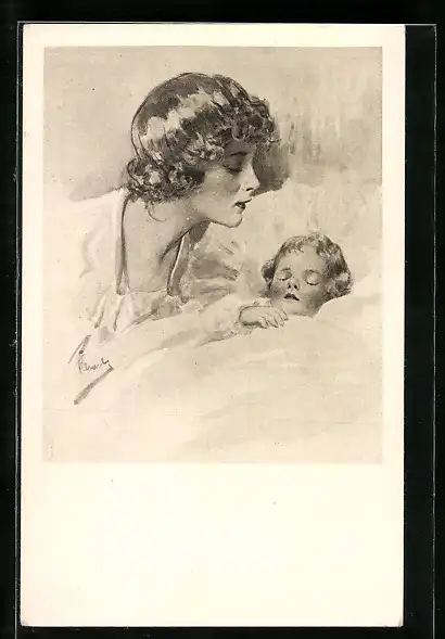 AK Junge Frau bei ihrem Kind am Bett, Mutterglück