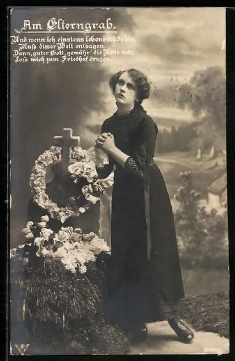 AK Junge Frau betet am Grab ihrer Eltern