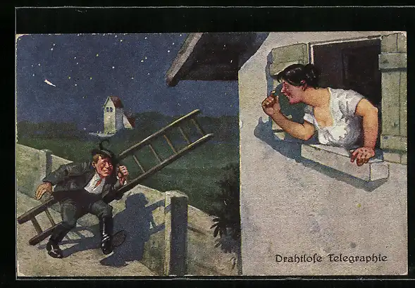 AK Junge Frau bittet ihren Liebhaber mit Leiter zu ihr zu kommen