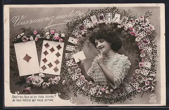AK Junge Frau in einem Kranz aus Spielkarten