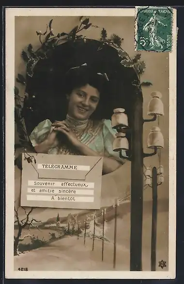 AK Junge Frau mit Gruss-Telegramm, Winterlandschaft mit Telegrammleitung