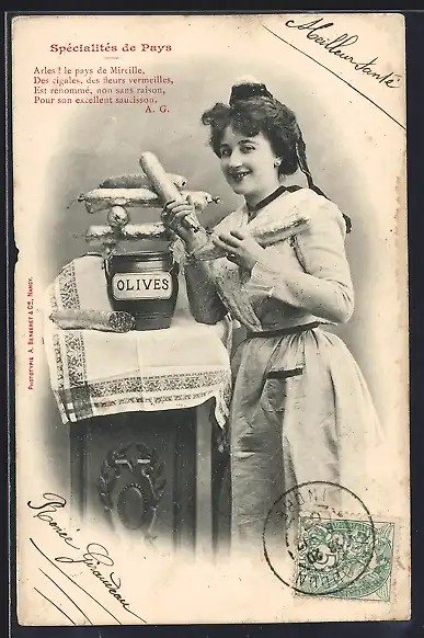 AK Junge Frau mit einer Wurst in der Hand, Spezialität aus Arles