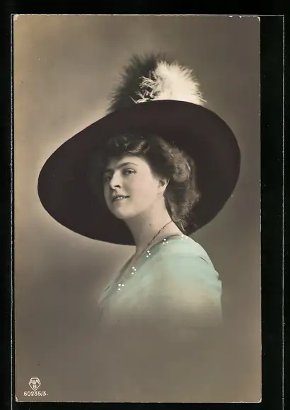 AK Junge Frau mit imposantem Hut und Feder darauf