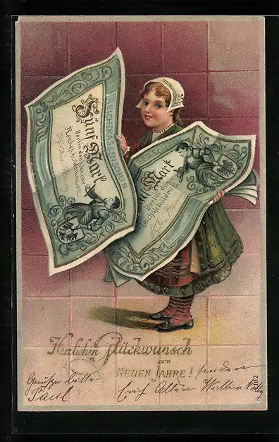 AK Junge Frau mit überbringt Geldscheine zum Neuen Jahr