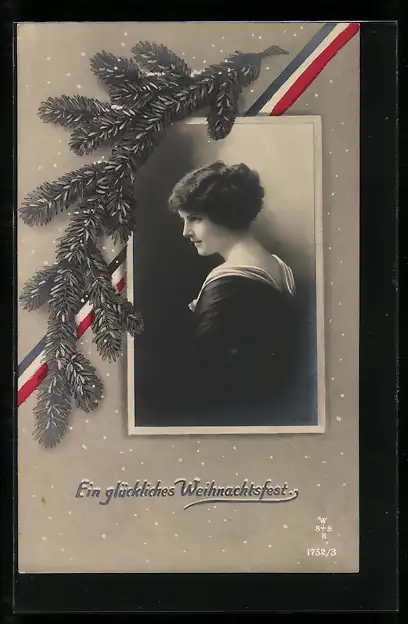 AK Junge Frau mit welligem Haar, Passepartout mit Tannenzweig und Reichsfarben, Weihnachtskarte