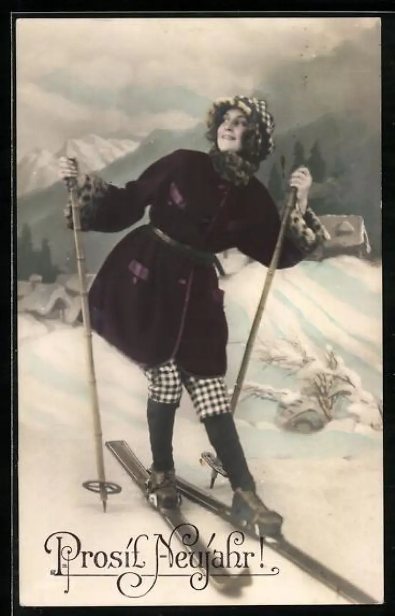 AK Junge Skiläuferin vor einer Ortschaft im Gebirge, Neujahrsgruss