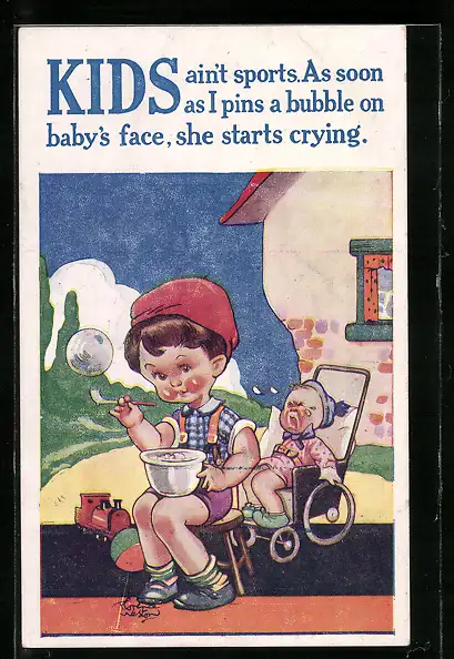 AK Junge ärgert ein Kleinkind mit Seifenblasen