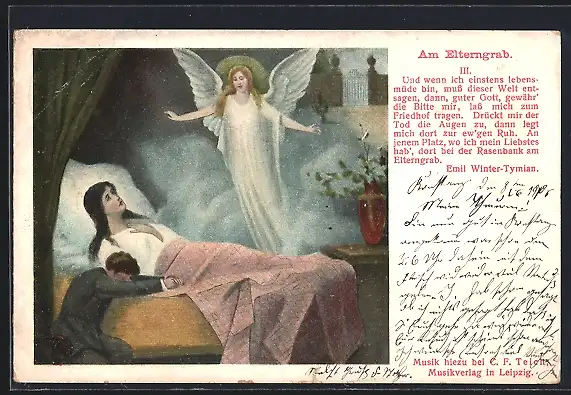 AK Junge am Totenbett der Mutter, Gedicht Am Elterngrab