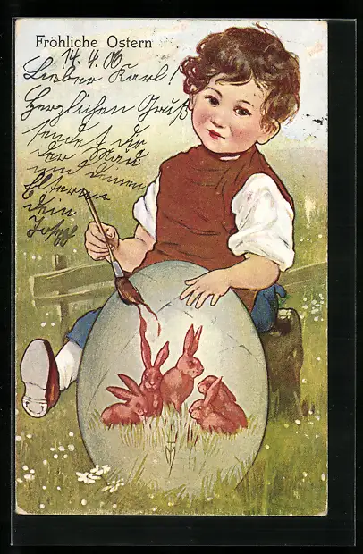 AK Junge bemalt Ei mit Osterhasen-Motiv