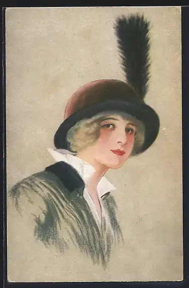 AK Junge hübsche Dame mit Federhut