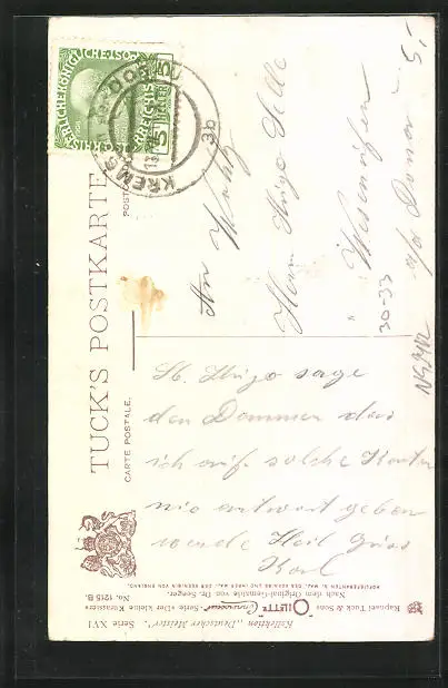 Personenbezogene Daten auf der Rückseite der Karte wurden durch blauen Textmarker unkenntlich gemacht. Die blauen Stellen sind auf die Vorderseite durchgeweicht und wirken sich negativ auf das Postkartenfoto aus
