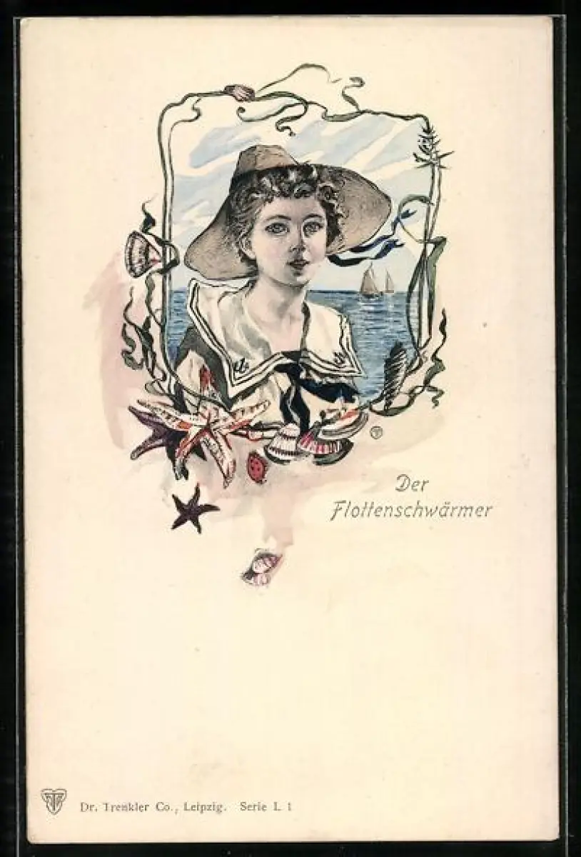 AK Junge mit Hut steht am Meer mit Segelschiffen im Hintergrund, Jugendstil