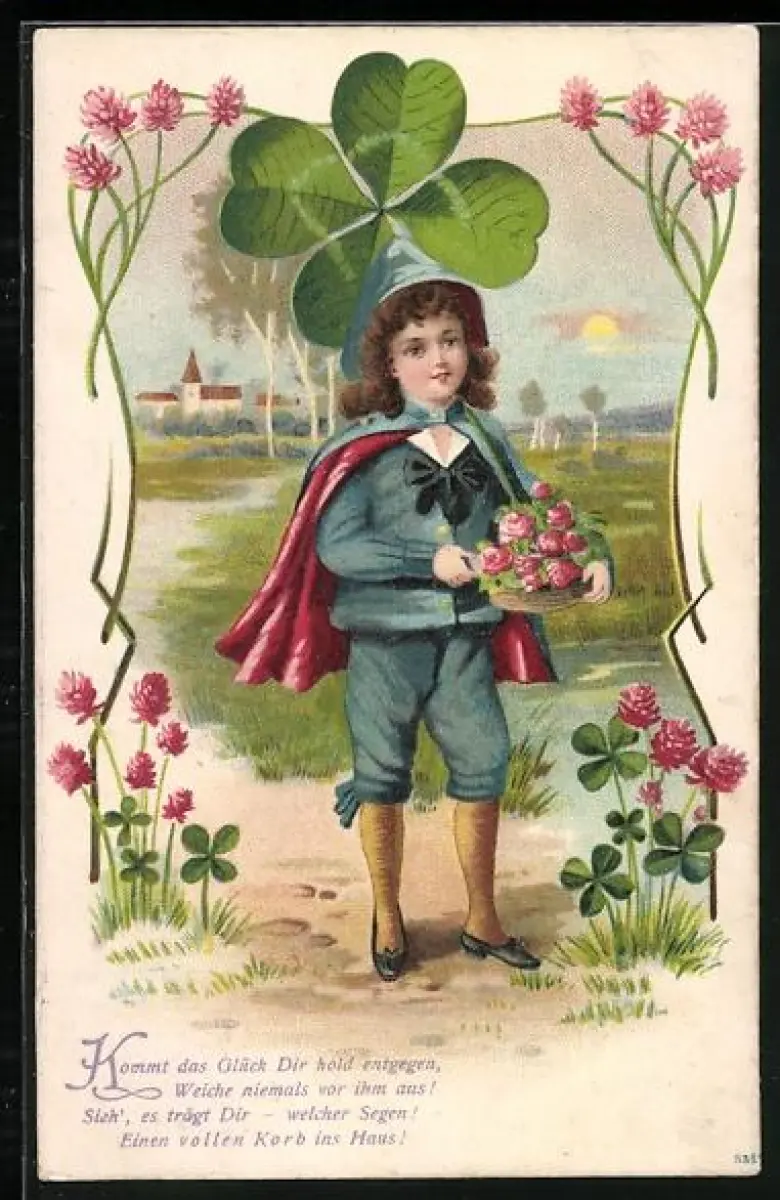 AK Junge mit Umhang, Klee und Blumen, Kommt das Glück Dir hold entgegen, weiche niemals vor ihm aus