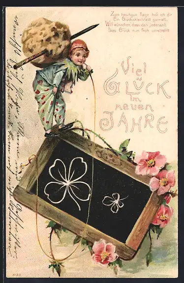 AK Junge steht auf einer Tafel mit aufgemalten Kleeblättern, Neujahr