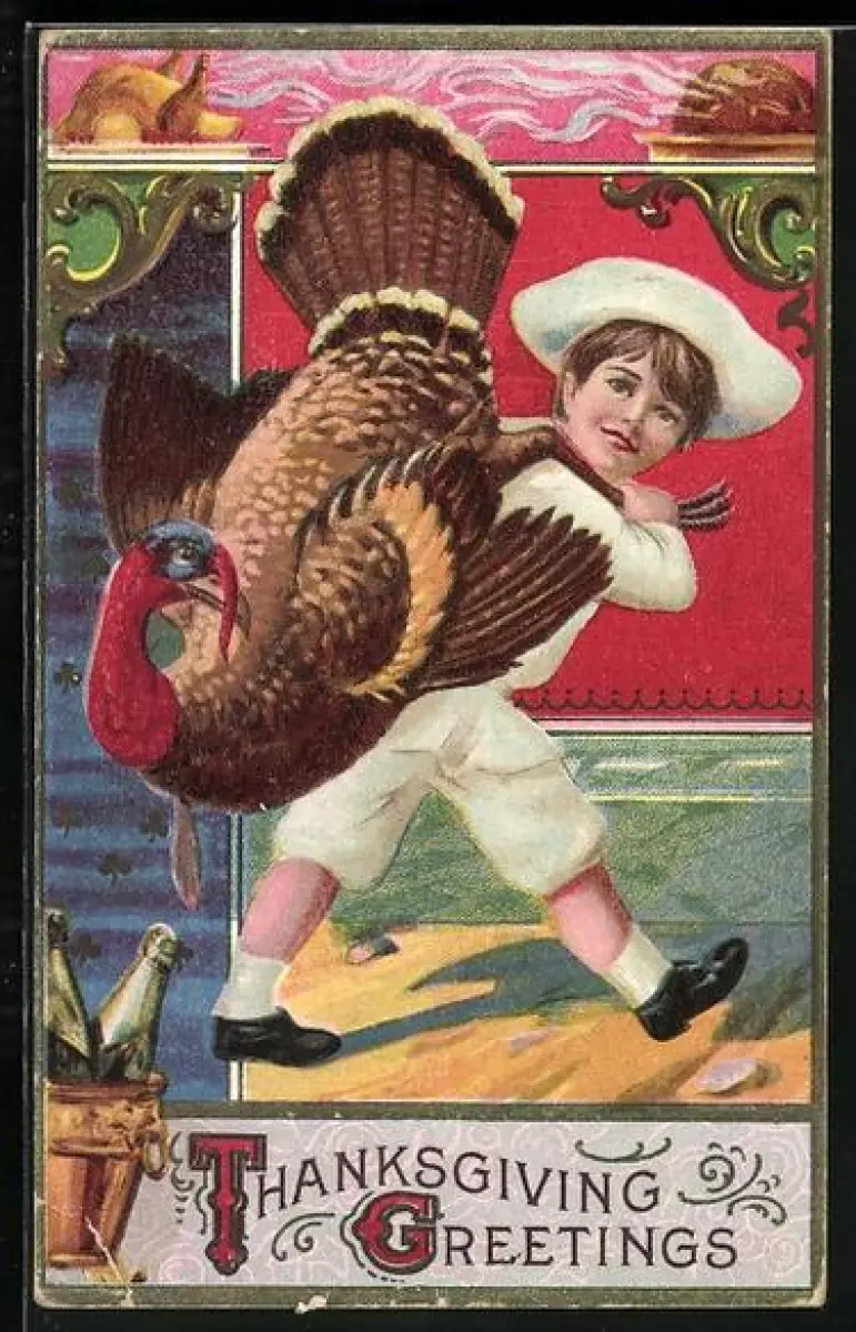 AK Junge trägt einen Truthahn auf den Schultern, Thanksgiving Greetings