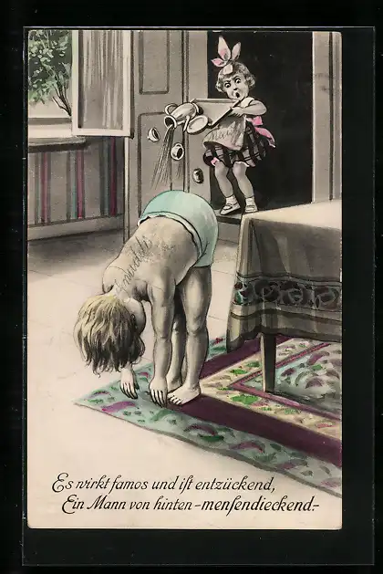 AK Junge turnt und Mädchen fällt das Tablett runter