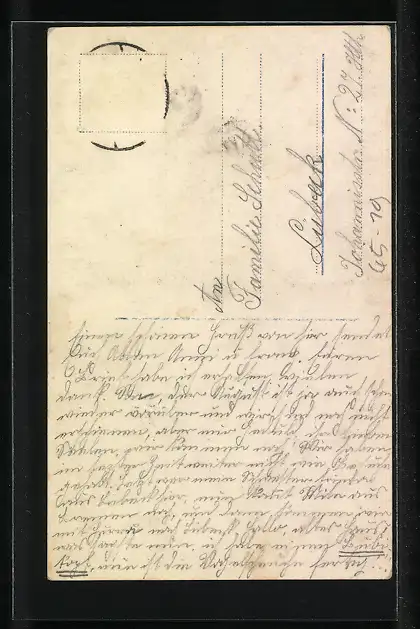 Personenbezogene Daten auf der Rückseite der Karte wurden durch blauen Textmarker unkenntlich gemacht. Die blauen Stellen sind auf die Vorderseite durchgeweicht und wirken sich negativ auf das Postkartenfoto aus