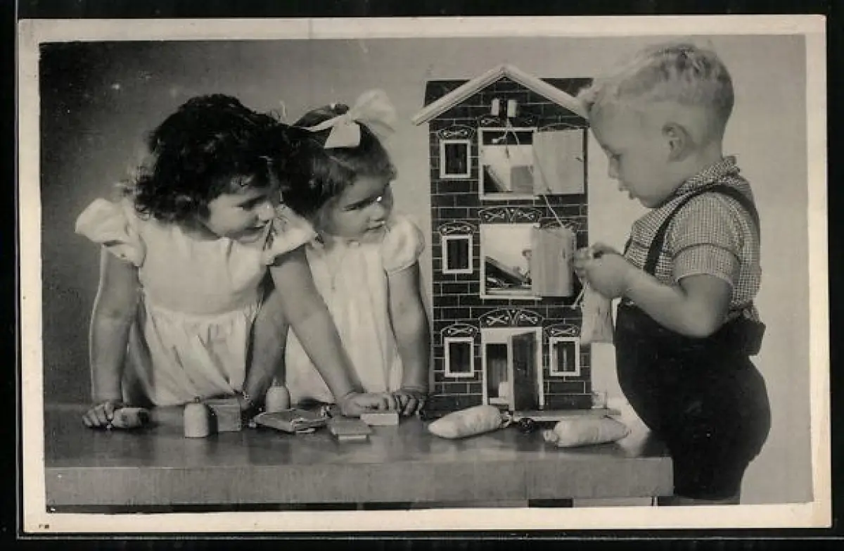 AK Junge und zwei Mädchen mit einem Spielzeughaus
