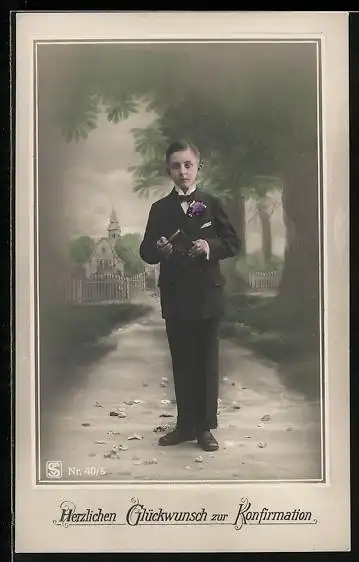AK Junge zu seiner Konfirmation vor einer Kirche