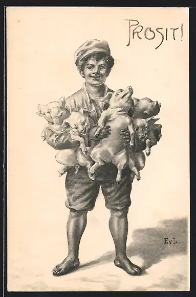 AK Junger Bursche mit Ferkeln auf den Armen, Neujahrsgruss