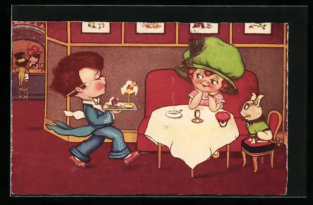 AK Junger Kellner bringt dem Mädchen das Eis an den Tisch