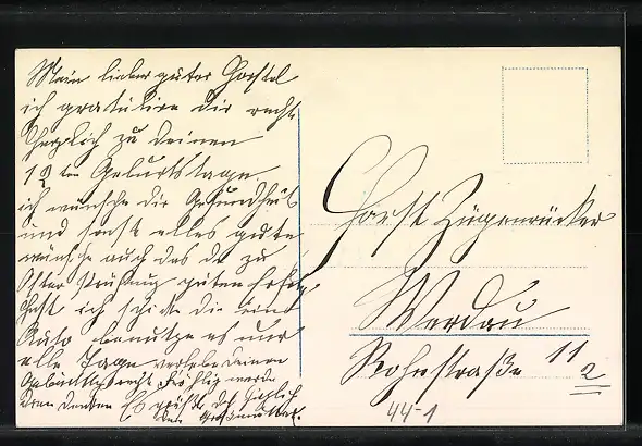 Personenbezogene Daten auf der Rückseite der Karte wurden durch blauen Textmarker unkenntlich gemacht. Die blauen Stellen sind auf die Vorderseite durchgeweicht und wirken sich negativ auf das Postkartenfoto aus