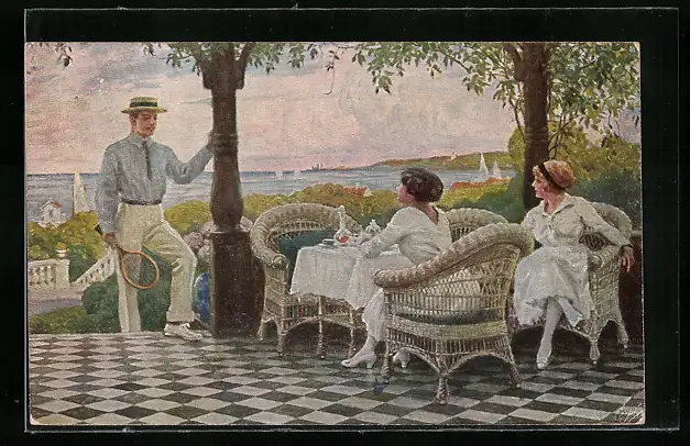 AK Junger Mann mit Tennisschläger besucht die Damen beim Frühstück