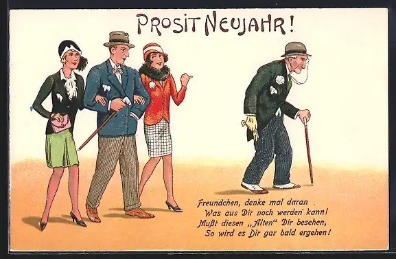 AK Junger Mann mit zwei jungen Damen, Gebeugter Greis, Neujahrsgruss