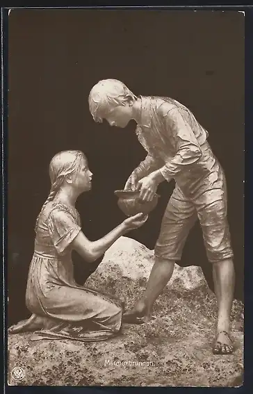 AK Junger Mann und Frau am Märchenbrunnen, vermenschlichte Statue